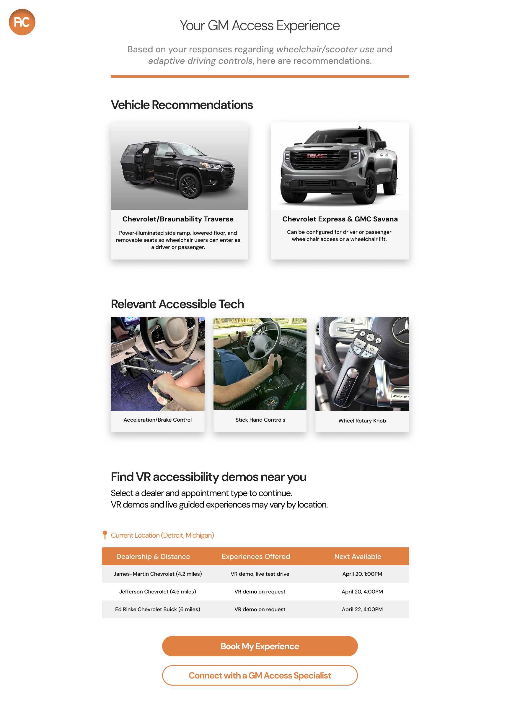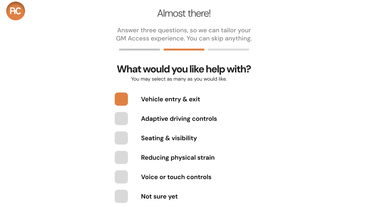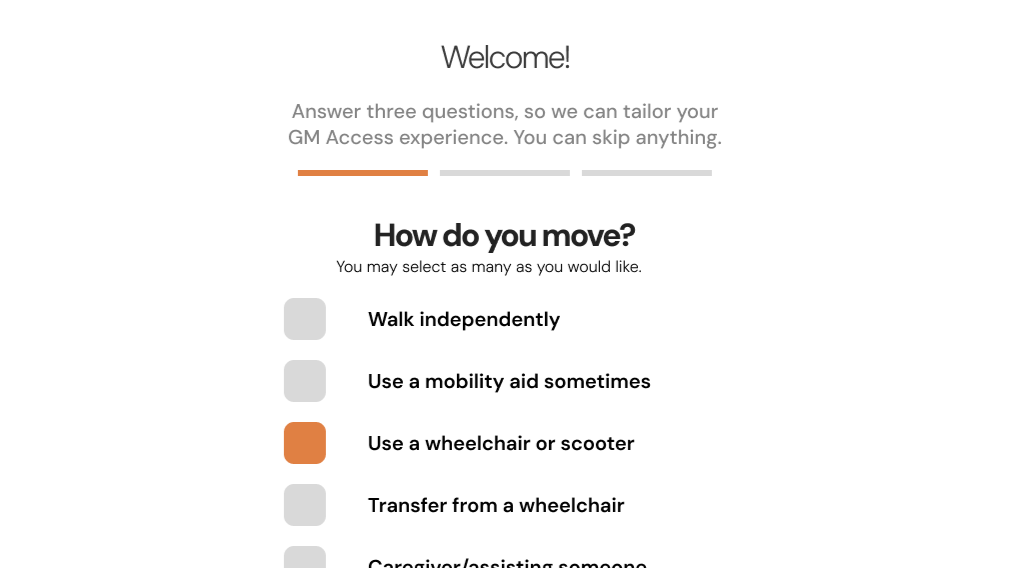 The Home page for GM Access shows how users are at the center of the service. The very first impression focuses on the person and the joy around accessible tech. To show how it’s built with the community and that’s how you empower the community.