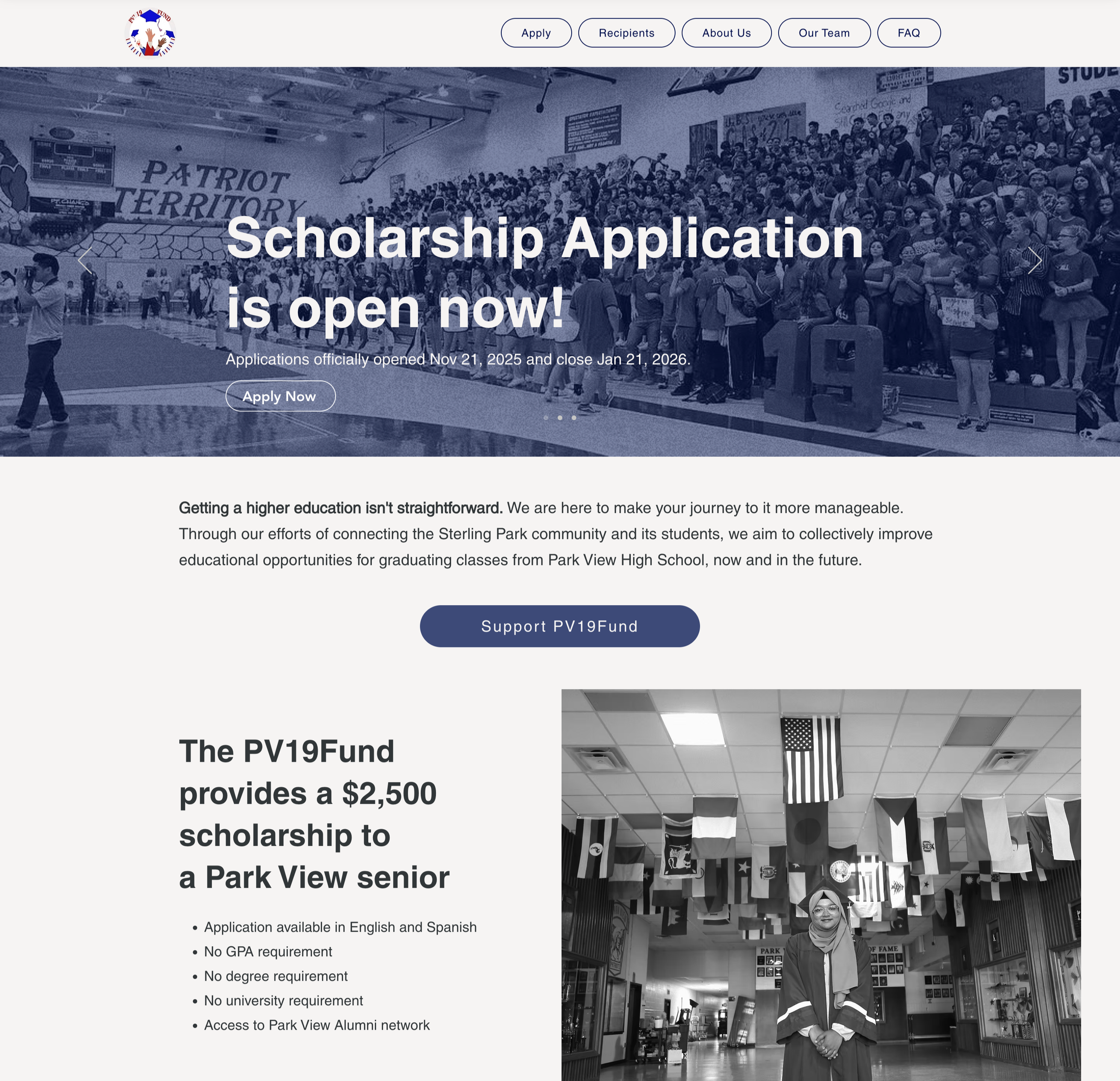 The PV19 Fund is a local scholarship to Sterling, VA, that provides a $2,500 scholarship to one Park View High school graduating senior. Started by alumnus, they released a website application in 2023 for their first scholarship cycle, using Wix to DIY their website design. The original site had usability issues, lack of CTA, and inconsistent web design.